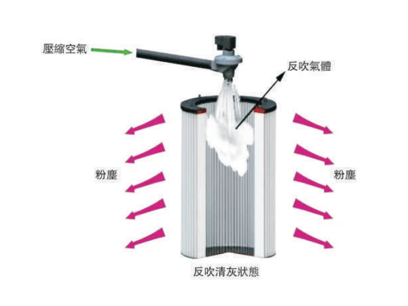 脈衝反吹系統由氣缸、電磁脈衝閥、脈衝反吹控制儀、壓縮空氣組成;系統采用漩渦式脈衝清灰結構,通過綫形控制,壓縮空氣經脈衝閥進入濾筒進行噴吹進行自動清灰功能,清灰區域可覆蓋整個濾筒。