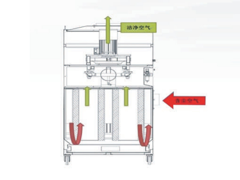 粉塵通過吸入口捕集進入集塵器後,含塵空氣從集塵器的進風均流裝置進入過濾室,首先碰到進風口中間的擾流板,由於氣流斷面突然擴大及在擾流板的作用下,氣流中一部分粗大顆粒直接沉降至灰門;粒度細、密度小的塵粒則在氣流通過濾筒時被過濾效果高達99%的濾筒過濾,截留在濾筒表面,并被脈衝反吹結構反吹落入灰門内,净化後的氣體進入净化室由集塵器上側風機室的排風口重新排放到車間裏。